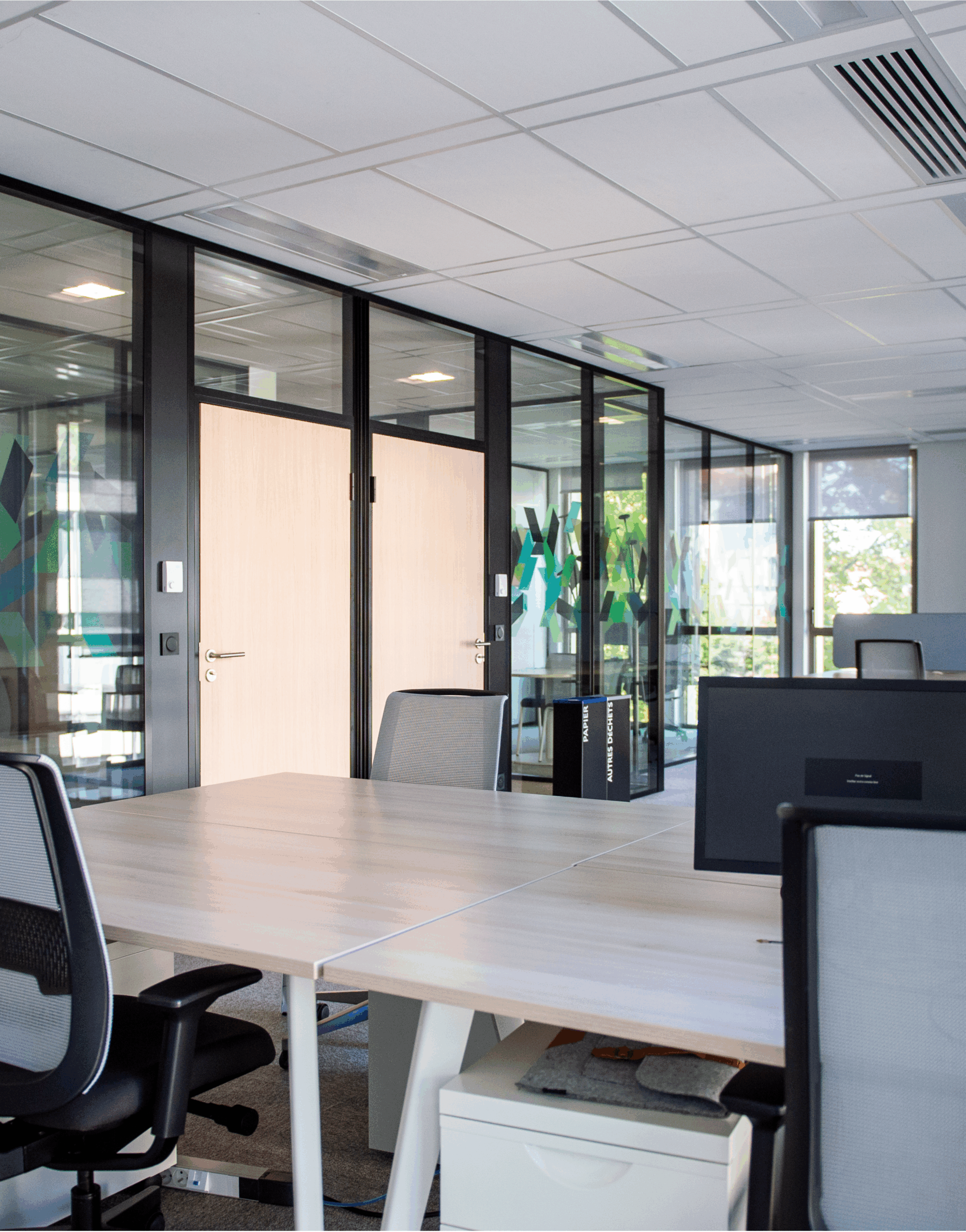 Au centre du projet, les cloisons sur mesure permettent de délimiter les zones de manière intelligente, sans fragmenter l’espace. Elles assurent une isolation acoustique là où elle est nécessaire, tout en laissant circuler la lumière naturelle et en préservant une lecture visuelle fluide du plateau. Chaque cloison est pensée pour s’adapter aux contraintes techniques et aux besoins fonctionnels des équipes.
