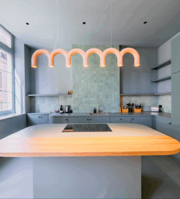 La cuisine, cœur du projet, se distingue par sa teinte eucalyptus. Pensée pour la convivialité, elle invite à la détente et aux échanges, avec mobilier intégré et banquette sur mesure, alliant élégance et confort. Cette couleur revient également dans la salle de réunion, pour créer de la cohérence et une atmosphère douce.