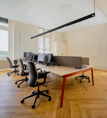 La grande salle de réunion illustre bien cette approche : son parquet en chevrons restauré apporte profondeur et caractère, un motif repris dans les openspaces pour créer une harmonie visuelle dans tout le bureau.